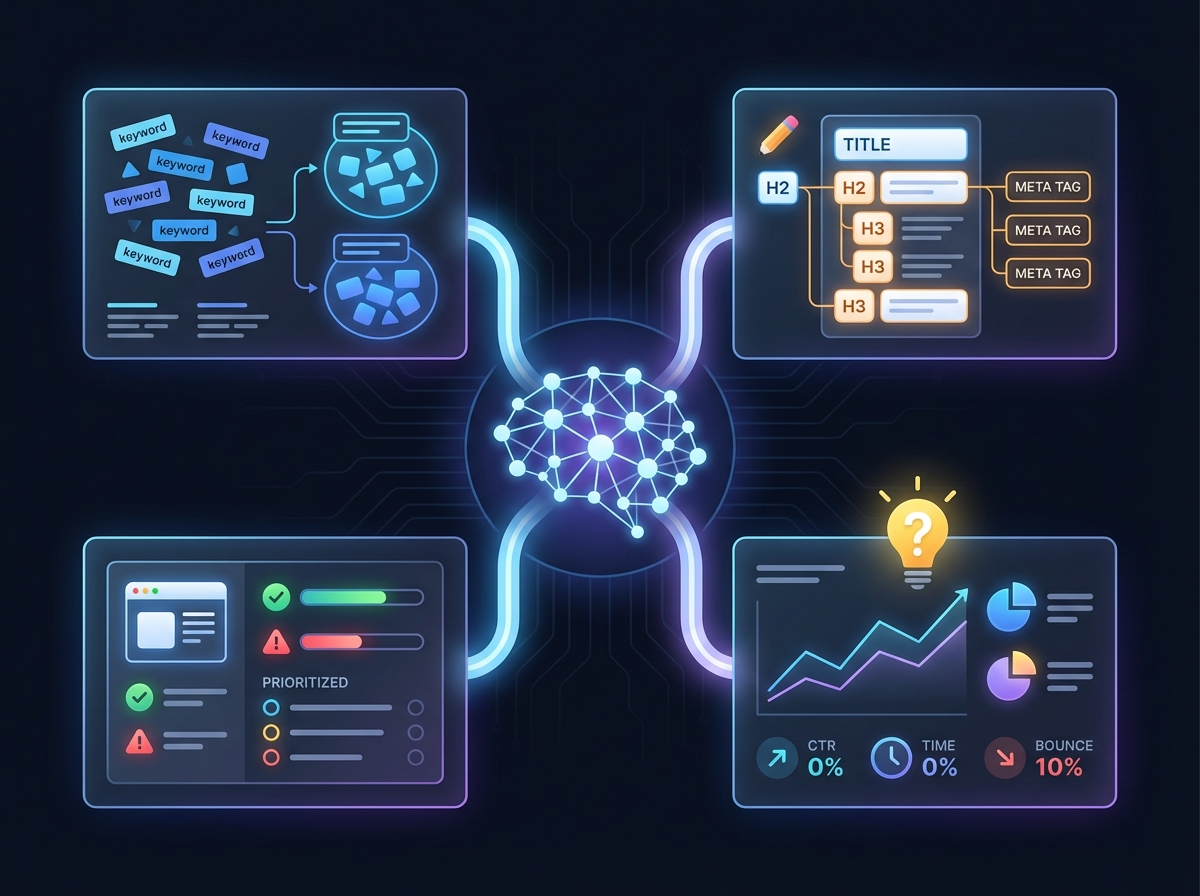 швидкий аналіз і групування ключових запитів та інтендів, щоб не працювати в сліпу і не писати на теми, які не відповідають реальному попиту;