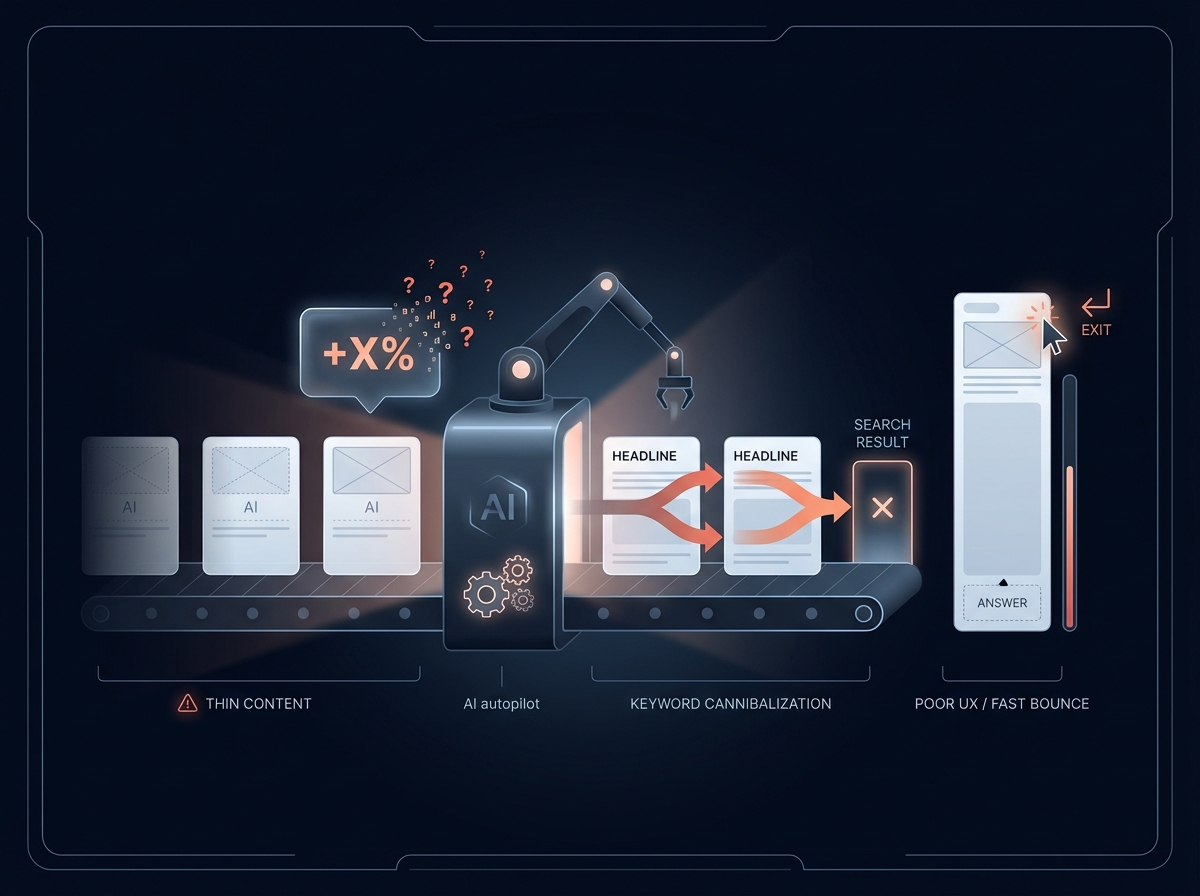 Третя проблема — дублікати: коли під різні ключі створюються майже однакові тексти, і сторінки починають конкурувати між собою, розмиваючи позиції.